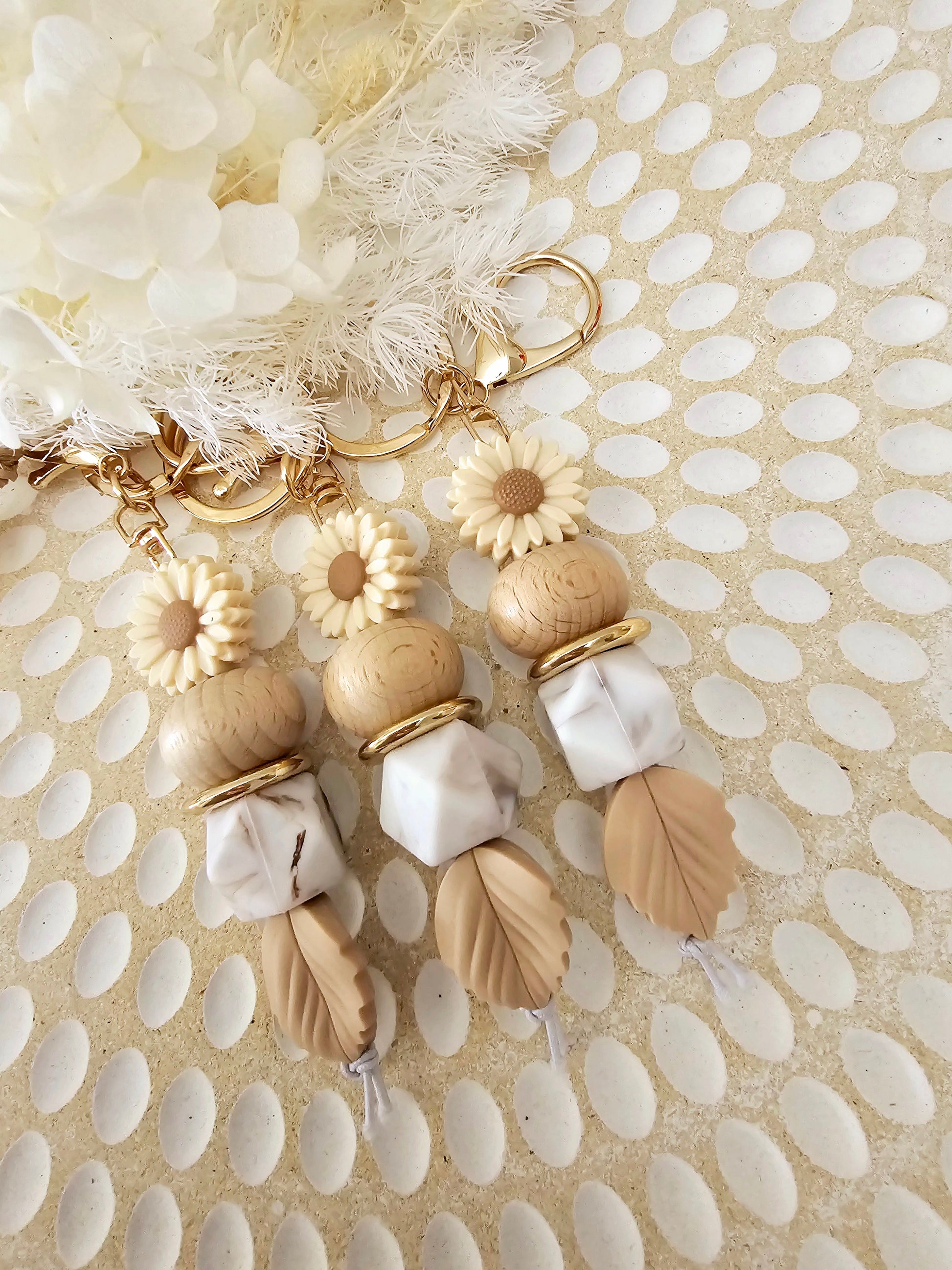 Handcrafted silicone keychains featuring floral accents and natural textures. A stylish accessory or thoughtful gift for any occasion.